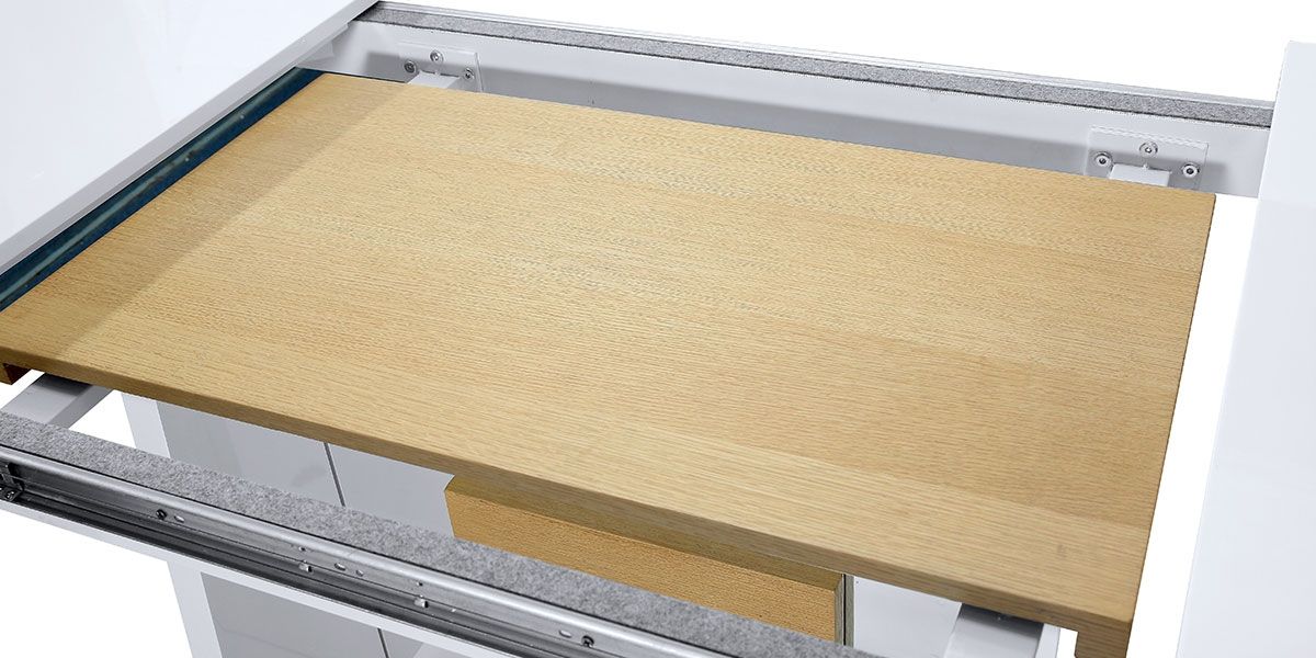 MatériauxPiétement : MDF laqué blanc + 10 mm verre trempé – Plateau : MDF laqué blanc + rallonge placage bois de chêne couleur nature